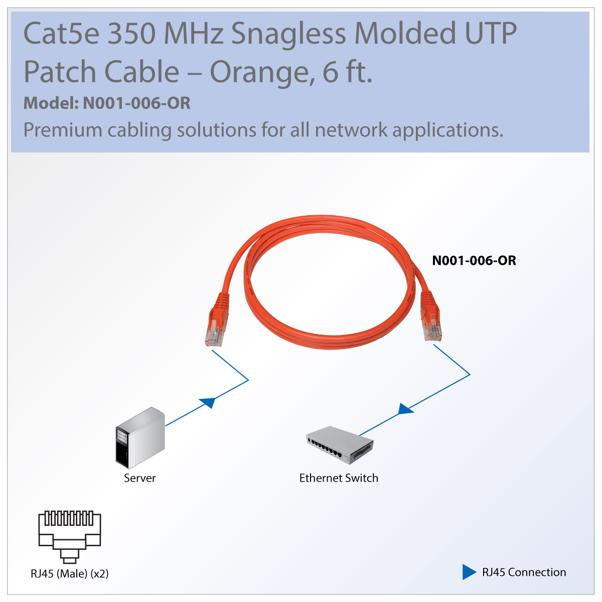Manufactured from 26 AWG 4-pair stranded UTP, the N001-006-OR provides high-speed connection and flawless signal delivery with minimal near-end crosstalk levels. This cable delivers speeds up to 350MHz/1 Gbps. Featuring a corrosion-resistant PVC jacket, the N001-006-OR is molded with integral strain relief for long life and durability. Gold-plated copper contacts ensure error-free signal transfer