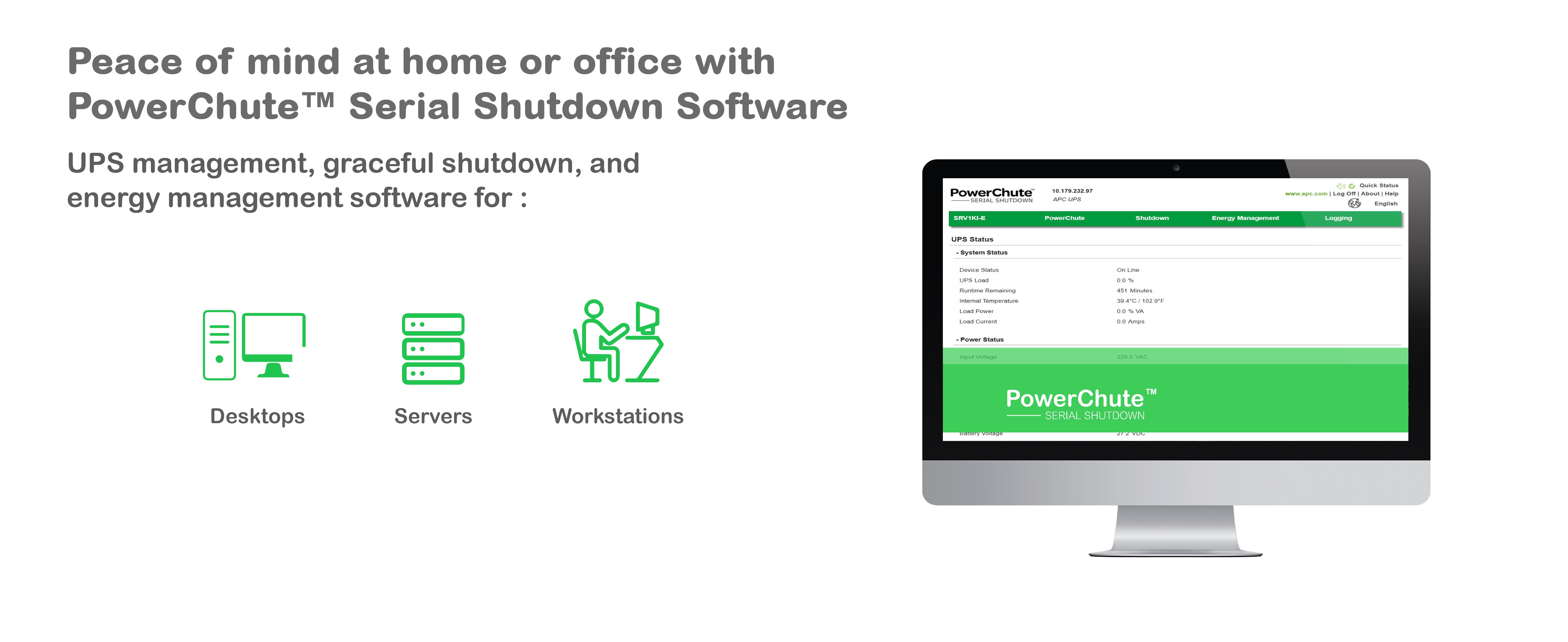 Options for monitoring and managing your UPS include EcoStruxure IT, Network Management Card, and PowerChute™ Network Shutdown Software.