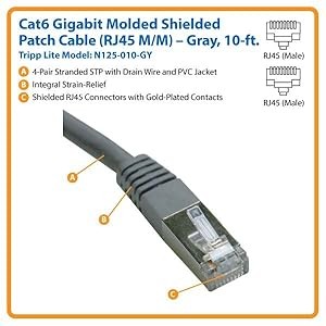 Manufactured from 4-pair stranded STP with drain wire, the N125-010-GY provides high-speed connection and flawless signal delivery. The cable can deliver speeds up to 550MHz/1 Gbps. Featuring a PVC jacket, this cable is constructed of top-quality materials for long life and durability. Its RJ45 (male) connectors are gold-plated and molded with integral strain-relief for accurate signal transfer and a secure connection. Its shielded construction provides extra protection against EMI/RFI line noise. This 10-ft. Tripp Lite Cat6 Gigabit Molded Shielded Patch Cable meets the most current industry standards, including IEEE 802.3ab, IEEE 802.5, ANSI/EIA/TIA 568, TSB 568B (AT&T 258A), ISO/IEC 11801 and ETL (category 6 draft 11).