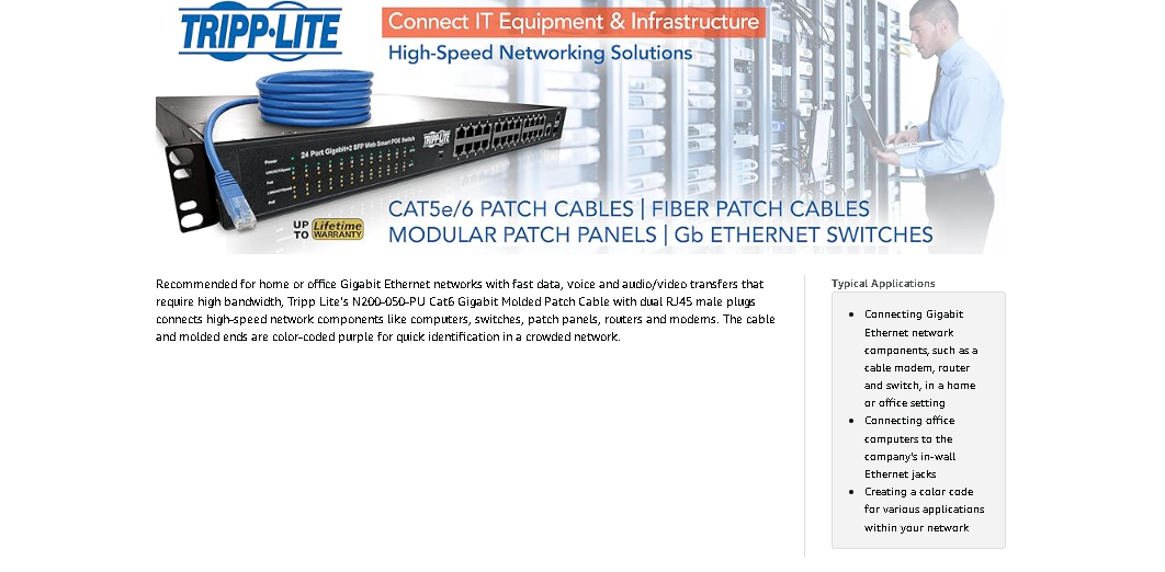 The N200-050-PU comes with a lifetime warranty. It’s manufactured in compliance with strict RoHS specifications, reflecting Tripp Lite’s commitment to environmental responsibility.