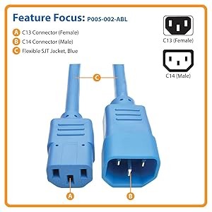 The P005-002-ABL features a blue SJT jacket and fully molded blue ends, allowing you to easily identify your connections in a crowded rack or workstation.