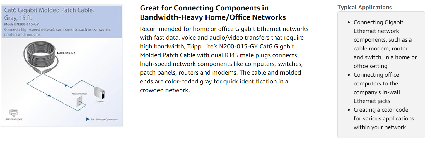 The N200-015-GY meets most current industry standards, including IEEE 802.3ab, IEEE 802.5, ANSI/EIA/TIA 568, ISO/IEC 11801 and ETL (category 6 draft 11). It holds near-end crosstalk (NEXT) levels to a minimum, while delivering a flawless signal. It is designed for 1000Base-T (Gigabit Ethernet), 10/100Base-T (Ethernet), 100 Mbps TPDDI, 155 Mbps ATM, ISDN, voice, Token Ring Type 3 and EIA/TIA applications.