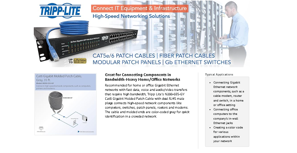 The N200-035-GY comes with a lifetime warranty. It’s manufactured in compliance with strict RoHS specifications, reflecting Tripp Lite’s commitment to environmental responsibility.