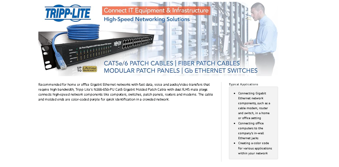 The N200-050-PU comes with a lifetime warranty. It’s manufactured in compliance with strict RoHS specifications, reflecting Tripp Lite’s commitment to environmental responsibility.