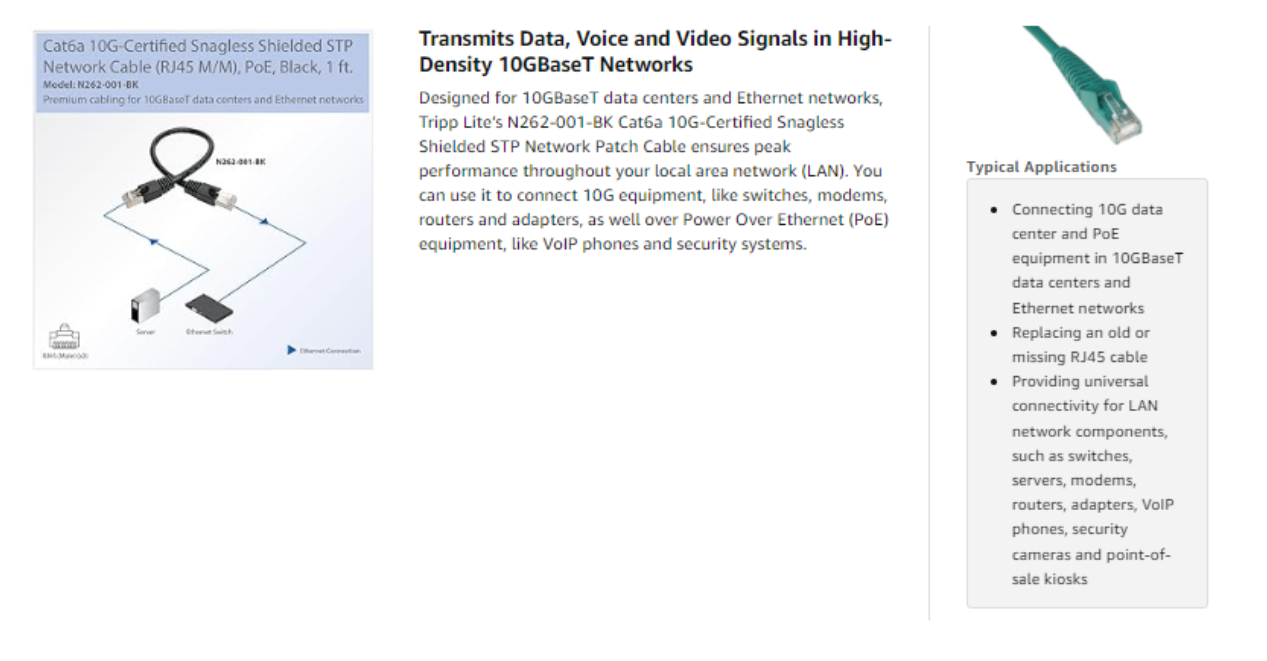 When you choose this genuine Tripp Lite cable, you get superior performance plus peace of mind. We’re so confident of its quality that we warrant it to be free from defects in material and workmanship for life! The N262-001-BK is also manufactured in compliance with strict RoHS specifications, reflecting Tripp Lite’s commitment to environmental responsibility.
