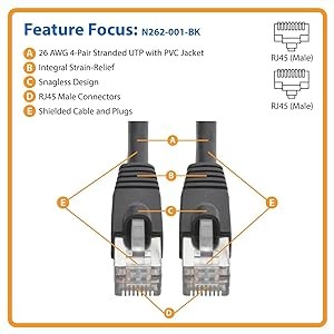 Made from 26 AWG 4-pair shielded copper, the N262-001-BK protects against line noise and EMI/RFI interference. Shielded RJ45 connectors minimize Near-End Crosstalk (Next) levels, and molded, snagless boots prevent the locking connectors from breaking off during installation. A rugged PVC jacket provides protection, and integral strain relief allows the cable and connectors to move freely without cracking.