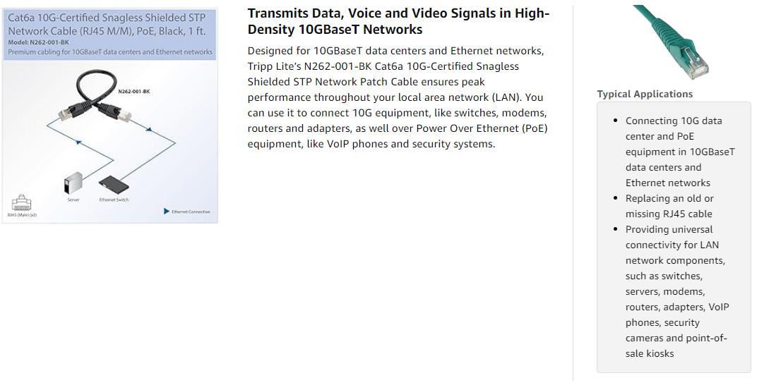 When you choose this genuine Tripp Lite cable, you get superior performance plus peace of mind. We’re so confident of its quality that we warrant it to be free from defects in material and workmanship for life! The N262-001-BK is also manufactured in compliance with strict RoHS specifications, reflecting Tripp Lite’s commitment to environmental responsibility.