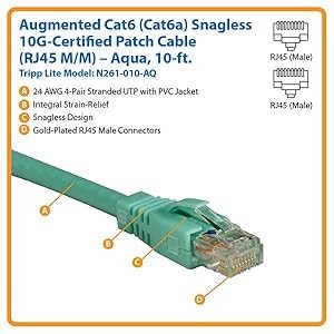 Manufactured from 24 AWG 4-pair stranded UTP, the N261-010-AQ provides high-speed connections and flawless signal delivery. Featuring a PVC jacket, this Cat6a cable is constructed of top-quality materials for long life and durability. Its RJ45 (male) connectors are gold-plated to ensure an accurate signal transfer. For a secure connection, the cable has molded integral strain-relief and a snagless design that protects the locking tabs on the RJ45 connectors from being damaged or snapped off during installation. The N261-010-AQ meets the most current industry standards, including IEEE 802.3af, IEEE 802.3ab, IEEE 802.5, ANSI/EIA/TIA 568, ISO/IEC 11801, DTE and ETL. The N261-010-AQ is fully tested on Fluke test equipment to guarantee that it meets or exceeds all Category 6 requirements. The test results are available upon request.