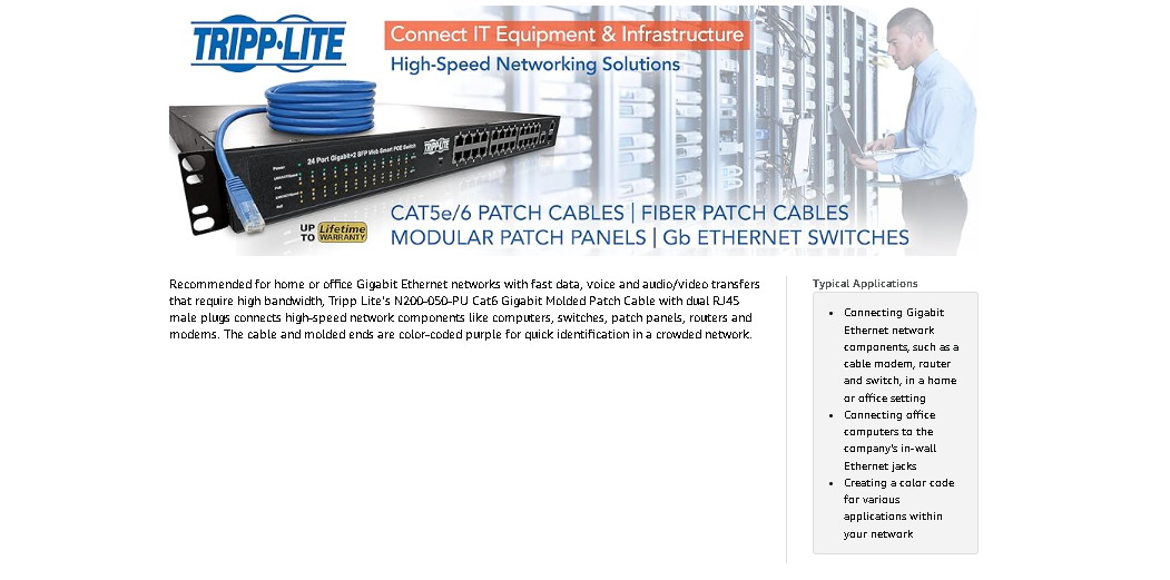 The N200-050-PU comes with a lifetime warranty. It’s manufactured in compliance with strict RoHS specifications, reflecting Tripp Lite’s commitment to environmental responsibility