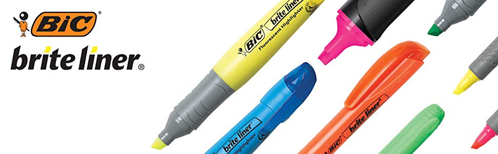 Available in five super-bright colors yellow, pink, orange, green, and blue BIC Brite Liner Highlighters allow you to easily color-code your notes and documents. The vivid fluorescent inks stand out on the page without obscuring the text underneath.