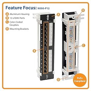 The N050-P12 enables quick and easy cable patching by plugging UTP Cat5e patch cables into any of its 12 RJ45 ports. Using a convenient wall-mount form factor, the N050-P012 supports 110-type punchdown termination and includes color-coded couplers for EIA/TIA 568A and 568B network applications.