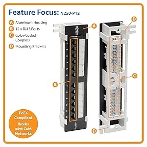 The N250-P12 enables quick and easy cable patching by plugging UTP Cat6 patch cables into any of its 12 RJ45 ports. Using a convenient wall-mount form factor, the N250-P12 supports 110-type punchdown termination and includes color-coded couplers for EIA/TIA 568A and 568B network applications.
