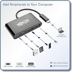 One USB-C connection provides USB-C and USB-A ports to accommodate your devices. This hub is also bus-powered, so you don’t have to travel with an external power supply.