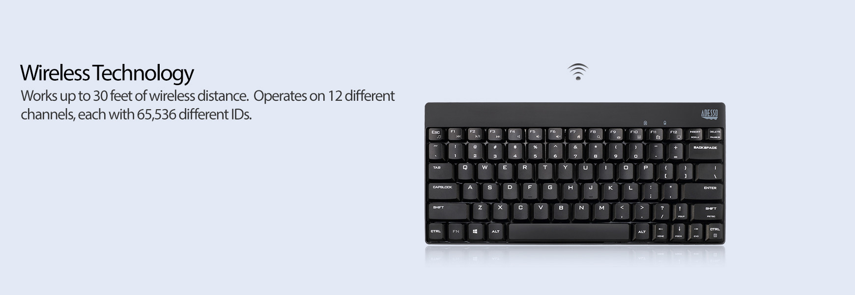 Works up to 30 feet of wireless distance. Operates on 12 different channels, each with 65,536 different IDs.