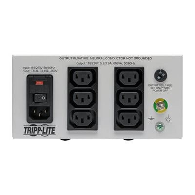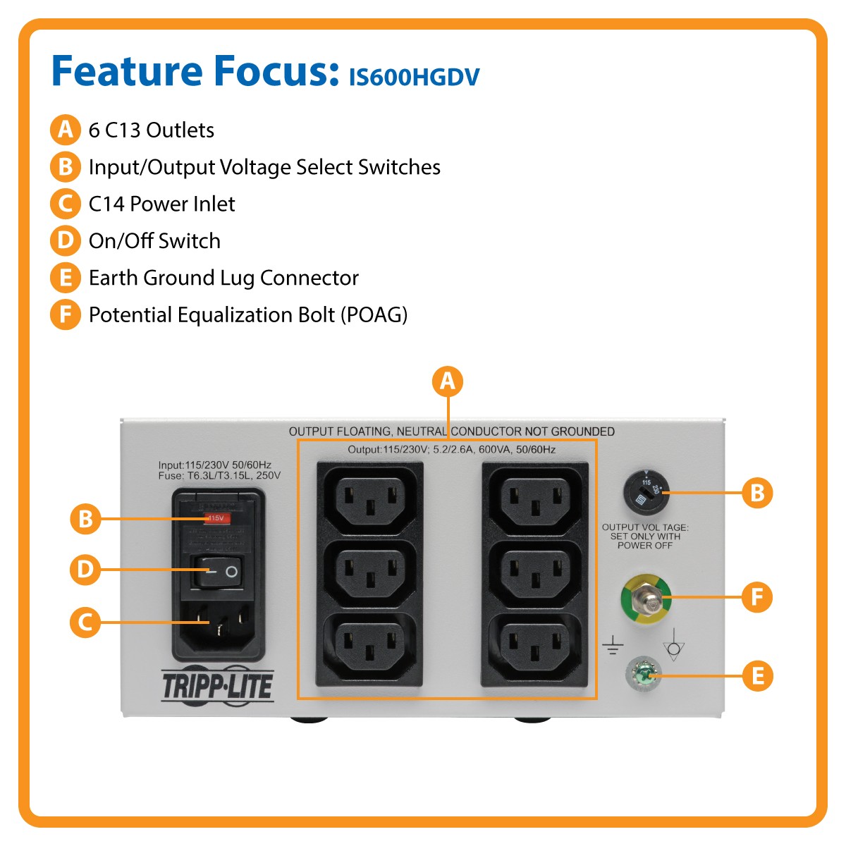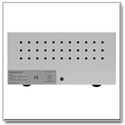 At 600 watts, the IS600HGDV can handle a variety of essential devices. Selectable 115V/230V input/output voltage with step-up, step-down or pass-through operation is also suitable for a wide range of devices and facilities. A 240-joule surge protection rating suppresses excess voltage to prevent it from damaging connected equipment (the unit automatically shuts down all outlets in case of overload). Transformer filtering provides continuous common-mode EMI/RFI line noise rejection with no wearable parts. The IS600HGDV reduces 6000V IEEE 587 Category A and B ring wave and combination wave test surges to only 0.5V common mode.