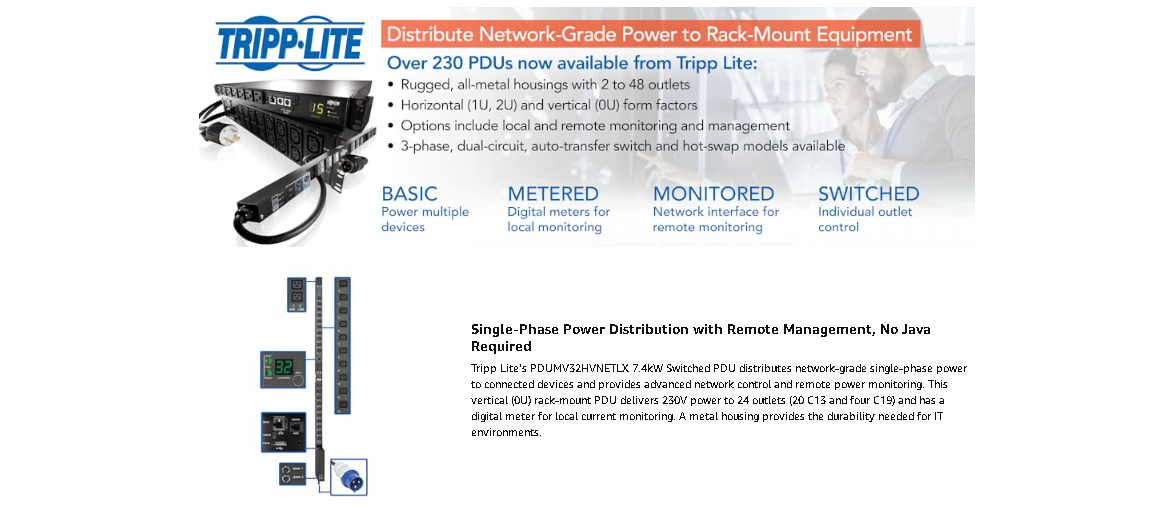 Individual Outlet Current Monitoring and Remote Outlet ControlThe PDUMV32HVNETLX offers the ability to turn on, turn off, recycle, or lock out power to all of its outlets as well as locally and remotely monitor each outlet’s output power consumption. This allows you to more efficiently manage network power consumption and properly balance loads both remotely and on-site. If equipment needs to be rebooted on a Sunday—no problem! Simply log on from wherever you are and take care of business. |