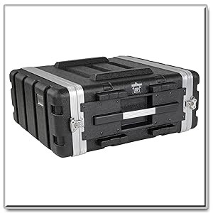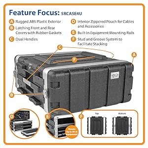 The SRCASE4U supports up to 4U of EIA-standard 19-inch equipment with a maximum depth of 20.5 inches. Its load capacity is 75 lb. Included mounting hardware simplifies placement of equipment, and a zippered pouch in one cover stores cables and accessories without taking up extra space.