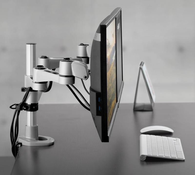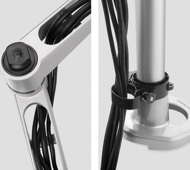 A built-in cable management system minimizes cable clutter without interfering with the ergonomic functionality of the mounting arm.