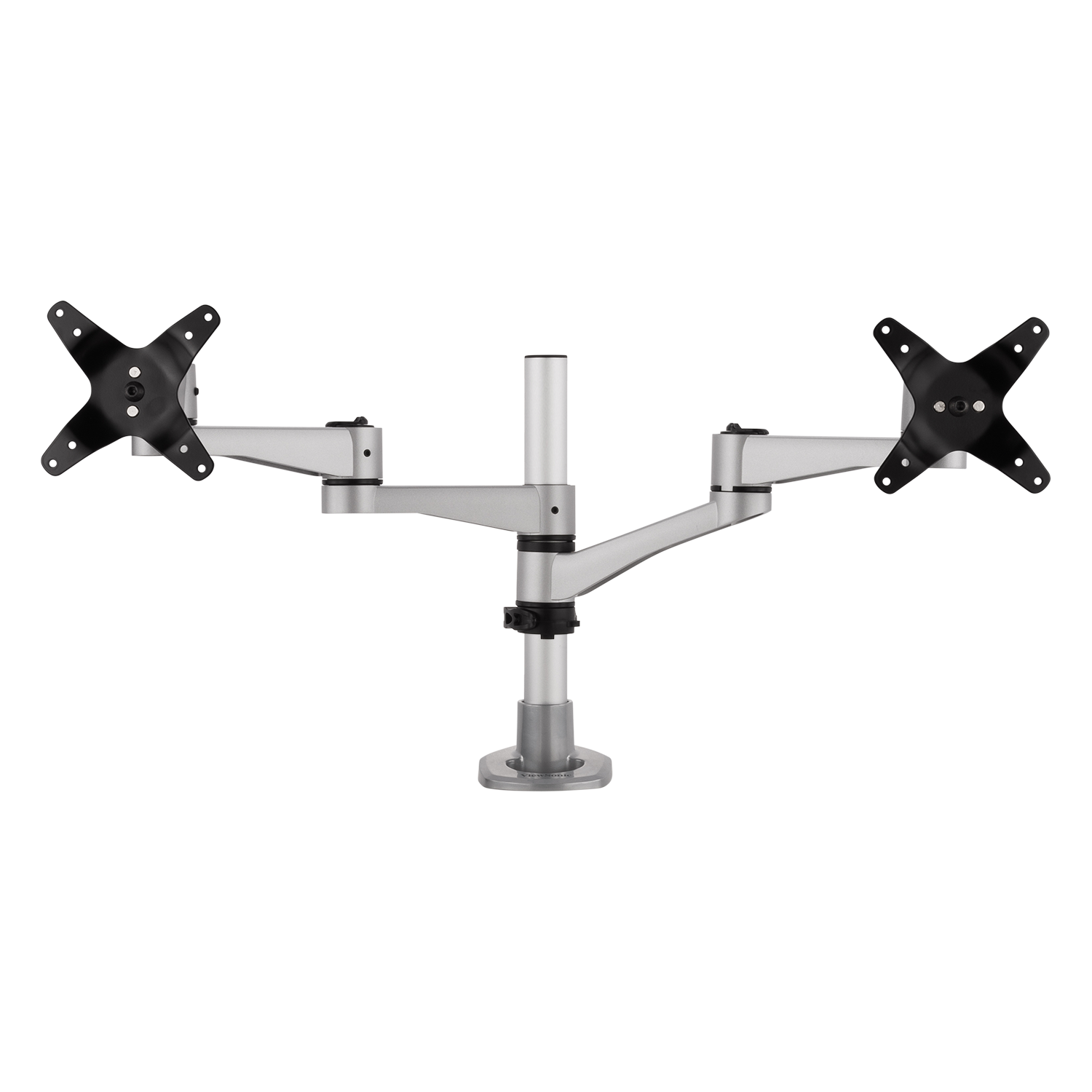 This dual monitor mounting arm accomodates two monitors up to 24" each, which frees up more space on your desktop.