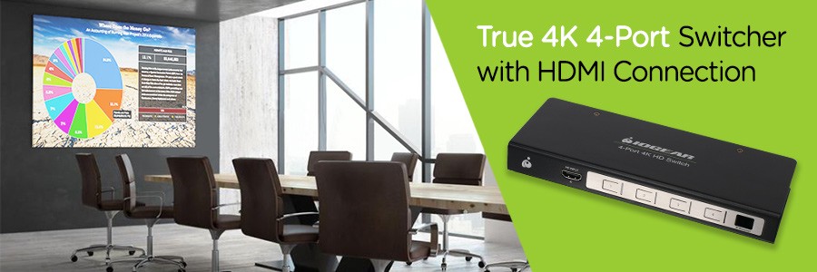 The IOGEAR 4-Port True 4K Switch with HDMI connection offers smooth, quick switching between four HDMI video sources such as a computer, Blu-ray or media player, and cable or satellite receivers and a single HDMI display. Send crystal clear, Cinema 4K video reaching true 4K resolutions to 4096 x 2160 @ 60Hz with 4:4:4 Chroma subsampling, High Dynamic Range (HDR) and uncompressed audio for any variety of uses including home theater, in lobbies and conference rooms and for digital signage.