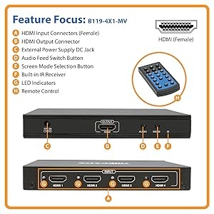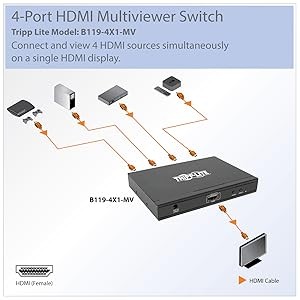 Tripp Lite’s B119-4X1-MV Multi-Viewer Switch connects up to 4 separate HDMI audio/video sources to a single HDMI television, projector or monitor, displaying all four feeds at the same time. Its built-in IR remote control feature lets you seamlessly switch between 1080p high-definition display options, providing a dynamic, customizable viewing experience.