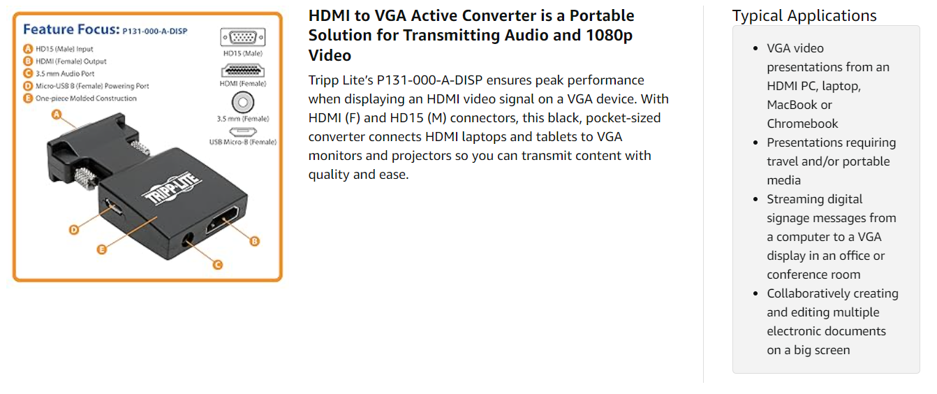 The P131-000-A-DISP active converter is ideal for “Bring-Your-Own-Device” video presentations on a VGA display. Its compact housing and plug-and-play setup make it portable and easy to connect. Keep it handy in your laptop bag when travelling to give presentations in conference rooms or to setup digital signage exhibits.