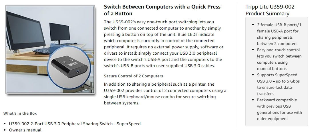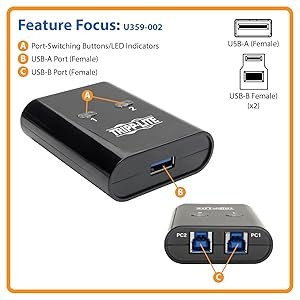 Tripp Lite’s U359-002 USB 3.0 sharing switch lets you share a printer, external hard drive, security camera or other USB-A device between 2 computers connected to its USB-B ports. Its one-touch port switching and up to 5 Gbps data transfer speeds allow you to manage shared peripherals in a fast, space-efficient way