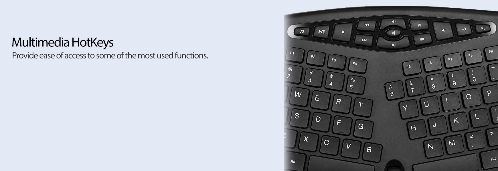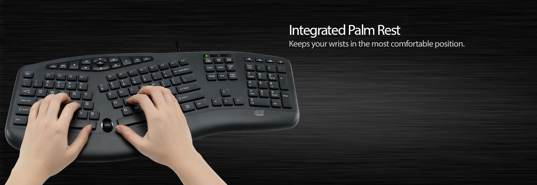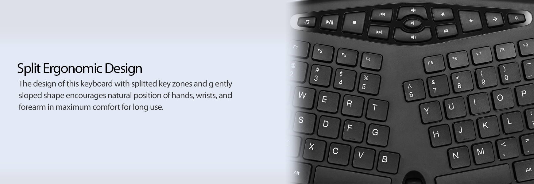 Split Ergonomic Design The design of this keyboard with split key zones and gently sloped shape encourages natural position of hands, wrists, and forearm in maximum comfort for long use. Integrated Palm Rest Keeps your wrists in the most comfortable position.