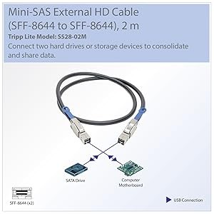 Tripp Lite’s two-meter S528-02M Mini-SAS HD Cable connects two hard drives or storage area network (SAN) devices to consolidate and share data in small- to medium-size organizations. It’s compatible with any storage device with HD SFF-8644 connectors, such as 12G RAID controllers, SATA hard drives, enclosures and JBOD arrays. For flexibility and convenience, it’s also backward compatible with previous SAS generations.