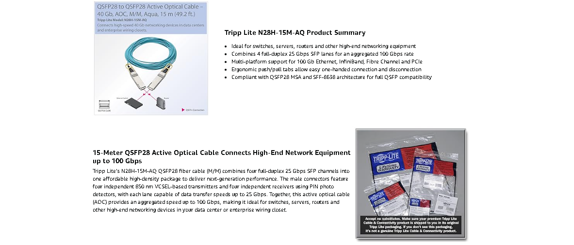 This QSFP28 to QSFP28 cable integrates a 100 Gbps Ethernet-optimized 38-position “board as connector” design. The plenum-rated OFNP jacket is designed for connecting network components in drop ceiling, walls and ducts. Die-cast zinc connectors are tested to meet stringent insertion loss standards, offer superior EMI resistance and reduce crosstalk. The QSFP28 optical cable is suitable for high-speed, short-reach dense data connections, such as 100GBASE-SR4 Ethernet, PCIe, Fibre Channel and InfiniBand applications.
