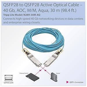 Tripp Lite’s N28H-30M-AQ QSFP28 fiber cable (M/M) combines four full-duplex 25 Gbps SFP channels into one affordable high-density package to deliver next-generation performance. The male connectors feature four independent 850 nm VCSEL-based transmitters and four independent receivers using PIN photo detectors, with each lane capable of data transfer speeds up to 25 Gbps. Together, this active optical cable (AOC) provides an aggregated speed up to 100 Gbps, making it ideal for switches, servers, routers and other high-end networking devices in your data center or enterprise wiring closet.