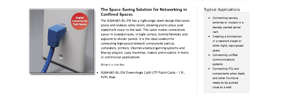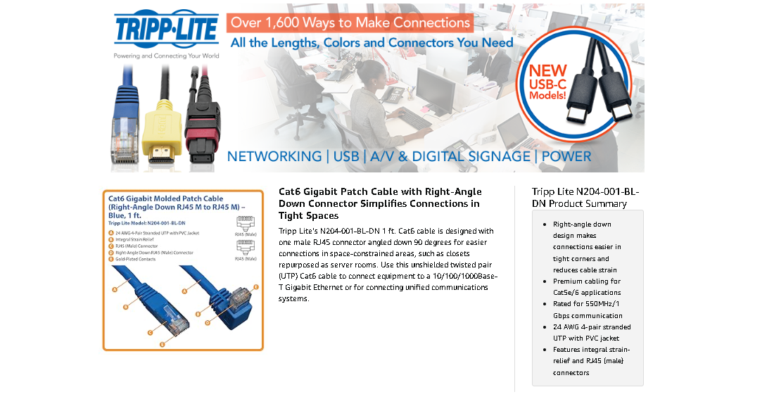 Manufactured from 24 AWG 4-pair stranded UTP, the N204-001-BL-DN provides high-speed connections and flawless signal delivery while keeping near-end crosstalk levels to a minimum. This cable can deliver speeds up to 550MHz/1 Gbps. Both of its male RJ45 connectors are gold-plated to ensure accurate signal transfer. The cable has a blue PVC jacket for color-coding and fast identification, with molded integral strain-relief that provides flexibility for a secure connection.