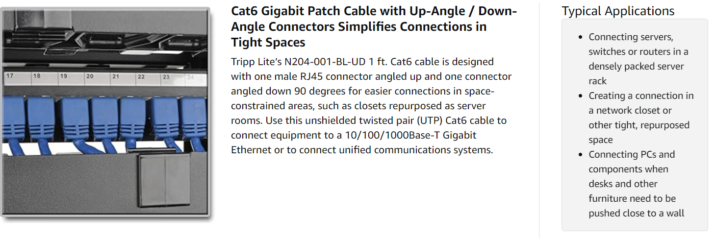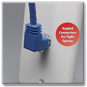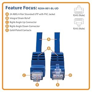 The N204-001-BL-UD has angled connectors to save space and reduce cable strain, allowing you to place your equipment closer to the wall. This cable makes connections easier in crowded racks, in tight corners, behind furniture and adjacent to divider panels. It is the ideal solution for connecting high-speed network components such as computers, printers, Internet-enabled gaming systems and Blu-ray players, copy machines, routers and modems in home or commercial applications.