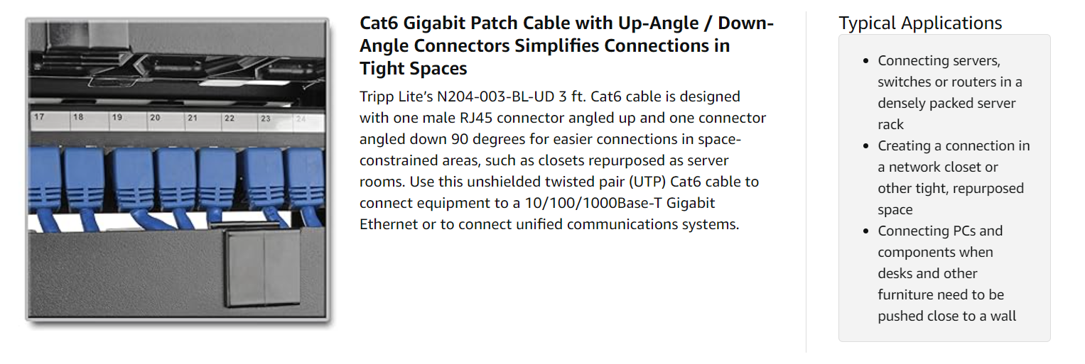 Manufactured from 24 AWG 4-pair stranded UTP, the N204-003-BL-UD provides high-speed connections and flawless signal delivery while keeping near-end crosstalk levels to a minimum. This cable can deliver speeds up to 550MHz/1 Gbps. Both of its male RJ45 connectors are gold-plated to ensure accurate signal transfer. The cable has a blue PVC jacket for color-coding and fast identification, with molded integral strain-relief that provides flexibility for a secure connection.