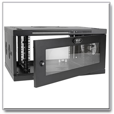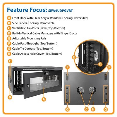Tame cable clutter with Tripp Lite’s 6U SmartRack® wall-mount rack enclosure cabinet with built-in cable management. Slightly wider than standard cabinets, the SRW6UDPGVRT has vertical finger ducts next to the adjustable mounting rails for orderly routing of cables. As a switch-depth-plus cabinet, the SRW6UDPGVRT is perfect for network switches, patch panels and other equipment up to 20.5 inches deep in locations with limited floor space.