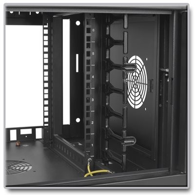 The cabinet ships fully assembled and ready for wall-mount installation with user-supplied hardware. Mounting rails are adjustable and have square and round (threaded) mounting holes. Rack spaces are numbered for easy equipment mounting with the included hardware. The side panels are removable for convenient access to equipment.