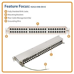 Tripp Lite’s N252-048-SH-K patch panel features 48 fully-shielded RJ45 ports for organizing your Cat5e/6 cable in just 1U of rack space. Its color-coded ports support EIA/TIA T568 A/B wiring standards for structured cabling, making it ideal for connecting computers, routers, switches, wireless access points, security cameras, sensors and other high-speed devices in a 5 Gbps Ethernet network.