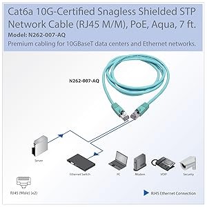 The N262-007-AQ Cat6a cable’s 10 Gbps speed ensures optimal performance across a 10GBase-T Ethernet network, including bandwidth-intensive switches, routers, modems, patch panels and adapters.