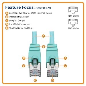 Made from 26 AWG 4-pair shielded copper, the N262-014-AQ protects against line noise and EMI/RFI interference that can disrupt transmissions and cause long-term hardware damage and data loss. Shielded RJ45 connectors minimize Near-End Crosstalk (NEXT) levels for clear data, voice and video signals.