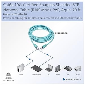 Tripp Lite’s N262-020-AQ Cat6a UTP patch cable transmits data, voice and video throughout your 10G network at blazing fast 10 Gbps. This 20 ft. cable supports Power over Ethernet (PoE), making it ideal for connecting IP devices like security cameras and wireless access points (WAPs) without requiring extra power cabling.