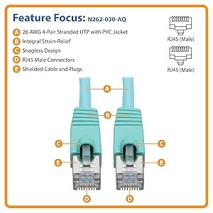 Made from 26 AWG 4-pair shielded copper, the N262-030-AQ protects against line noise and EMI/RFI interference that can disrupt transmissions and cause long-term hardware damage and data loss. Shielded RJ45 connectors minimize Near-End Crosstalk (NEXT) levels for clear data, voice and video signals.