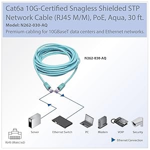 Tripp Lite’s N262-030-AQ Cat6a UTP patch cable transmits data, voice and video throughout your 10G network at blazing fast 10 Gbps. This 30 ft. cable supports Power over Ethernet (PoE), making it ideal for connecting IP devices like security cameras and wireless access points (WAPs) without requiring extra power cabling.