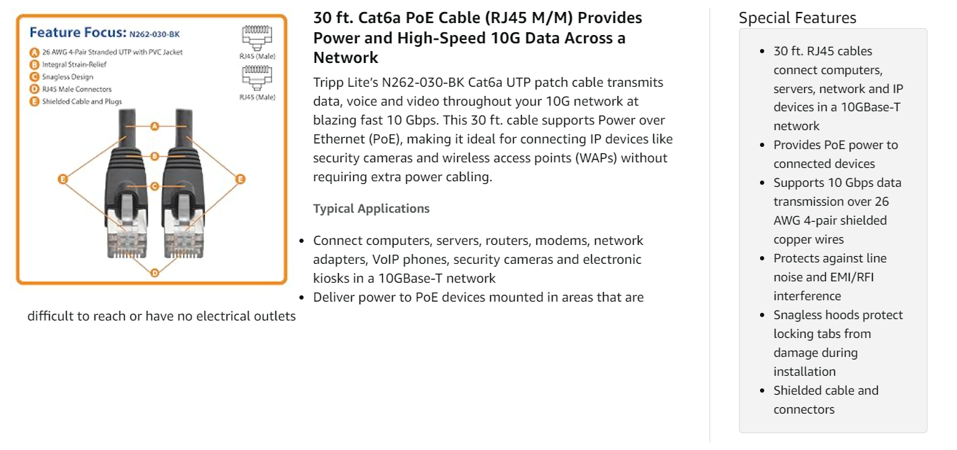 In addition to data, the N262-030-BK cable delivers power to connected devices. It’s ideal for Internet of Things (IoT) applications where a number of devices across a network are sending and receiving data; it can reduce the cost and space taken up by separate power cabling for these devices.
