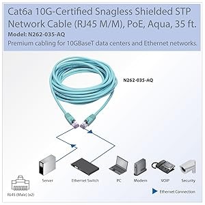 The N262-035-AQ Cat6a cable’s 10 Gbps speed ensures optimal performance across a 10GBase-T Ethernet network, including bandwidth-intensive switches, routers, modems, patch panels and adapters.
