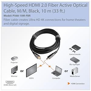 This 4K-capable cable securely connects HDMI-enabled laptops, tablets, PCs, Blu-ray players, game consoles or satellite/cable TV boxes to HDTVs, HD monitors, projectors or home theater receivers. Because the P568-10M-FBR uses optical fiber, it can transmit HDMI signals longer distances with no latency or loss. It also eliminates any EMI/RFI line noise that can interfere with your audio/video signal and disrupt the performance of your connected equipment.