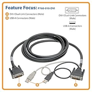Tripp Lite’s P760-010-DVI DVI to Dual USB-A KVM Cable (2xM/2xM) connects a DVI monitor and USB keyboard/mouse to your KVM switch’s DVI port. A replacement cable for the six-foot accessory included with Tripp Lite’s B021-000-19-HD or B021-000-19-HD2 consoles, this 10-foot accessory gives you more flexibility in placing your equipment. It features two male DVI connectors and two male USB-A connectors, and supports DVI video resolutions up to 1920 x 1200, including 1080p, at 60 Hz. Its slim diameter cuts down on cable clutter around your rack.