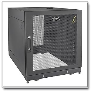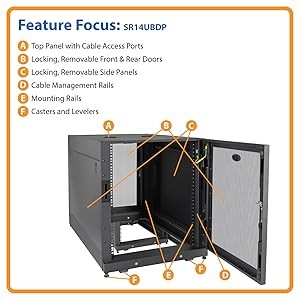 The SR14UBDP comes with four metal casters (and installation hardware) that let you maneuver the rack cabinet over a level, smooth, stable surface and through a standard doorway into position, where it can be stabilized by adjusting the levelers. Front and rear mounting rails adjust in quarter-inch increments to accommodate equipment up to 42 inches deep. Adjustable vertical cable management rails help keep the back of the rack organized.