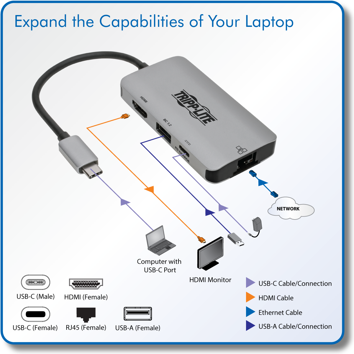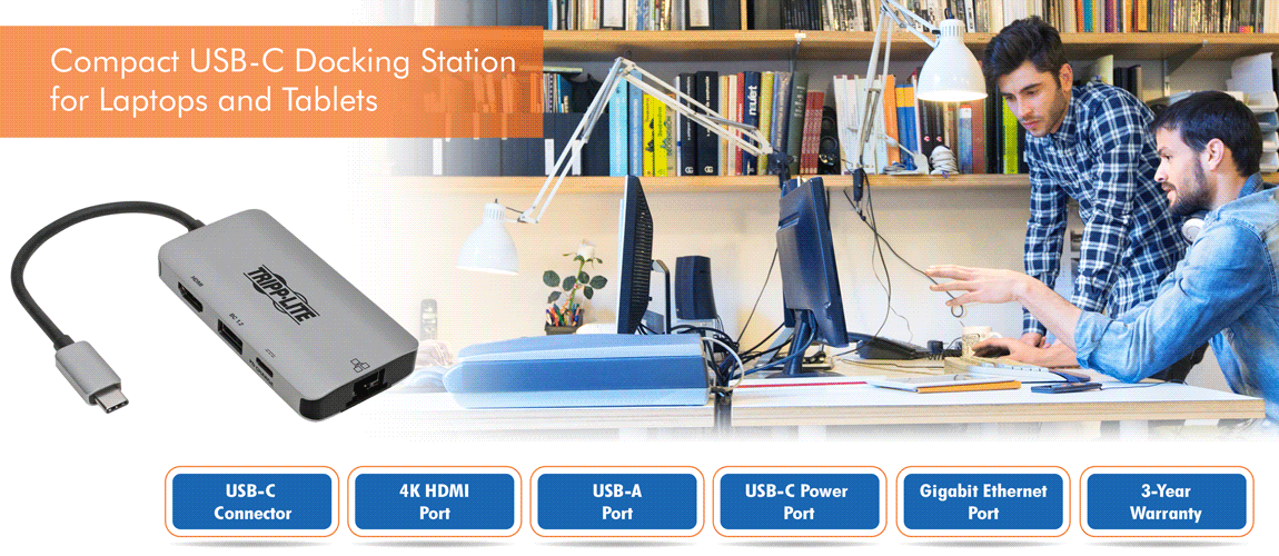 Newer tablets, laptops, Chromebook™ and MacBook® notebooks, desktop computers and even smartphones often have only USB Type-C® ports for connection to peripherals. This Tripp Lite docking station expands the functionality of the USB-C® or Thunderbolt™ 3 port on your computer and makes it compatible with more equipment.