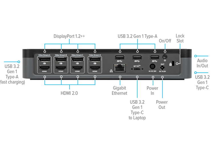 Your workstation has never been more powerful with a high-performance quad-monitor dock that supports full 4K (3840 x 2160 p60) resolution or DisplayPort (3840 x 2160 p60) on all four displays as well as viewing modes for two and three monitors. The eight available video out ports allow you to decide between HDMI or DP++ display options to ensure compatibility for your configuration.