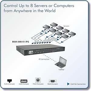 Tripp Lite's B064-008-01-IPG NetDirector 8-Port Cat5 IP KVM Switch is the smart solution for controlling multiple computers and servers in a complex, demanding IT environment. Its rugged housing, premium connectors and superior functionality ensure trouble-free operation. The B064-008-01-IPG can control up to 8 servers/computers directly, including blade servers. It is compatible with both PS/2 and USB connections using Tripp Lite B055-001-series server interface units and inexpensive Cat5/5e patch cables. Redundant dual power supplies ensure this KVM will continue running if the primary power supply fails. Built-in IP capability allows up to two users—one local and one remote—to access the network, either independently or simultaneously.